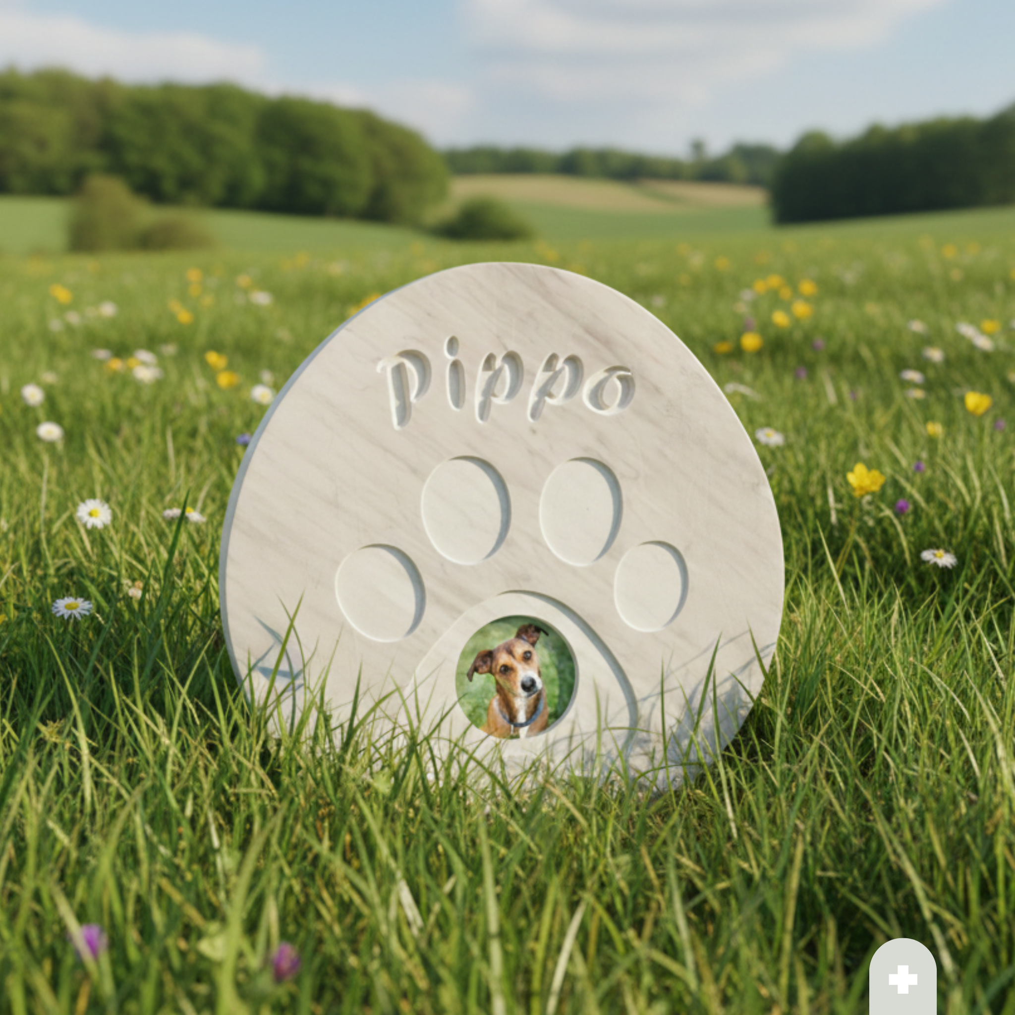 Fotografia in Porcellana: Al centro del polpastrello principale è incastonata una fotografia in porcellana (diametro 10 cm), per mantenere vivo lo sguardo e il volto del tuo animale con colori brillanti e resistenti.
